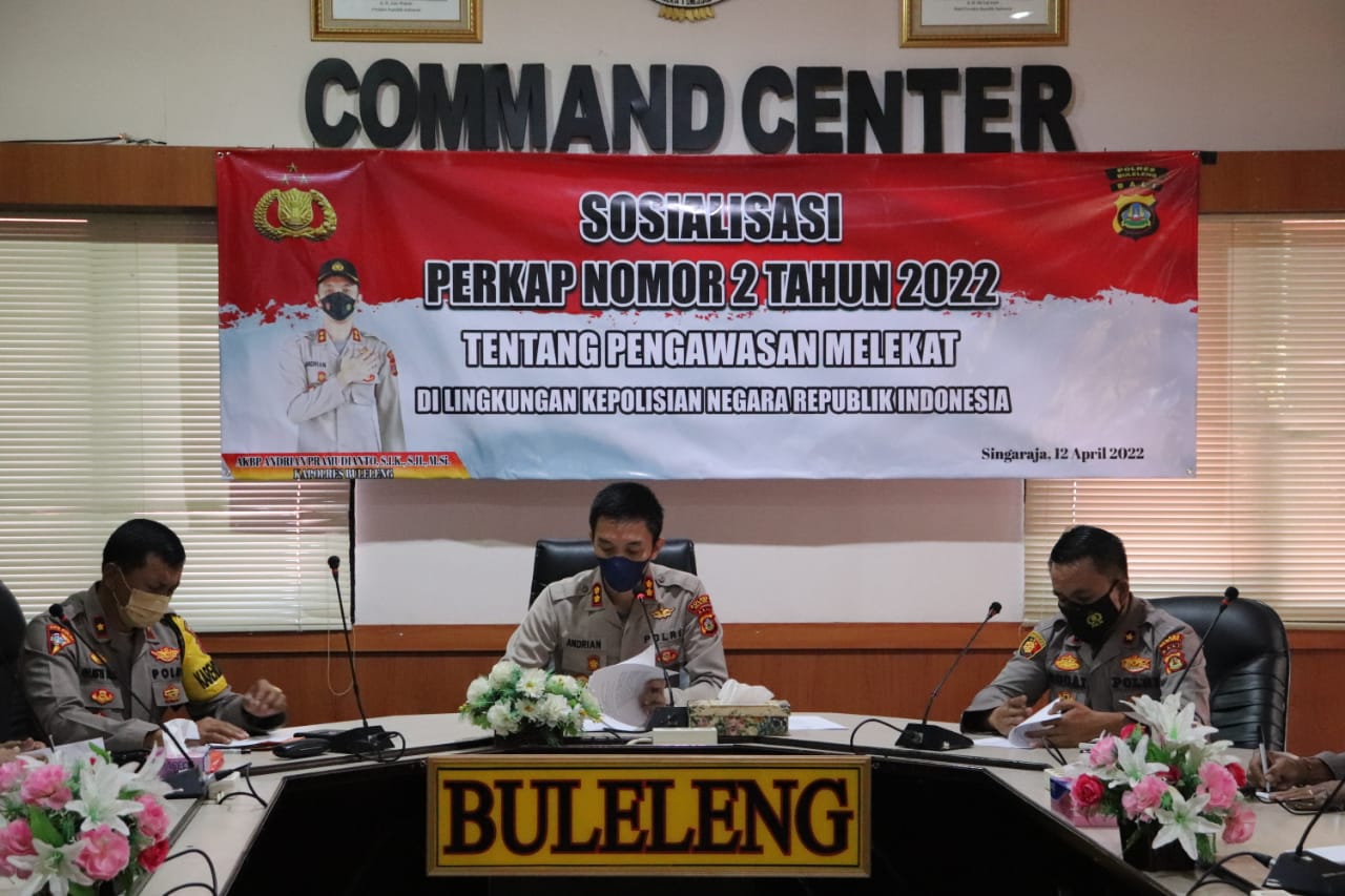 Menindak lanjuti Peraturan Kepala Kepolisian (Perkap) RI Nomor 2 Tahun 2022 tentang Pengawasan Melekat (Waskat) di lingkungan Polri, dilakukan sosialisasi yang disampaikan langsung Kapolres Buleleng AKBP Andrian P., S.I.K., S.H., M.Si.