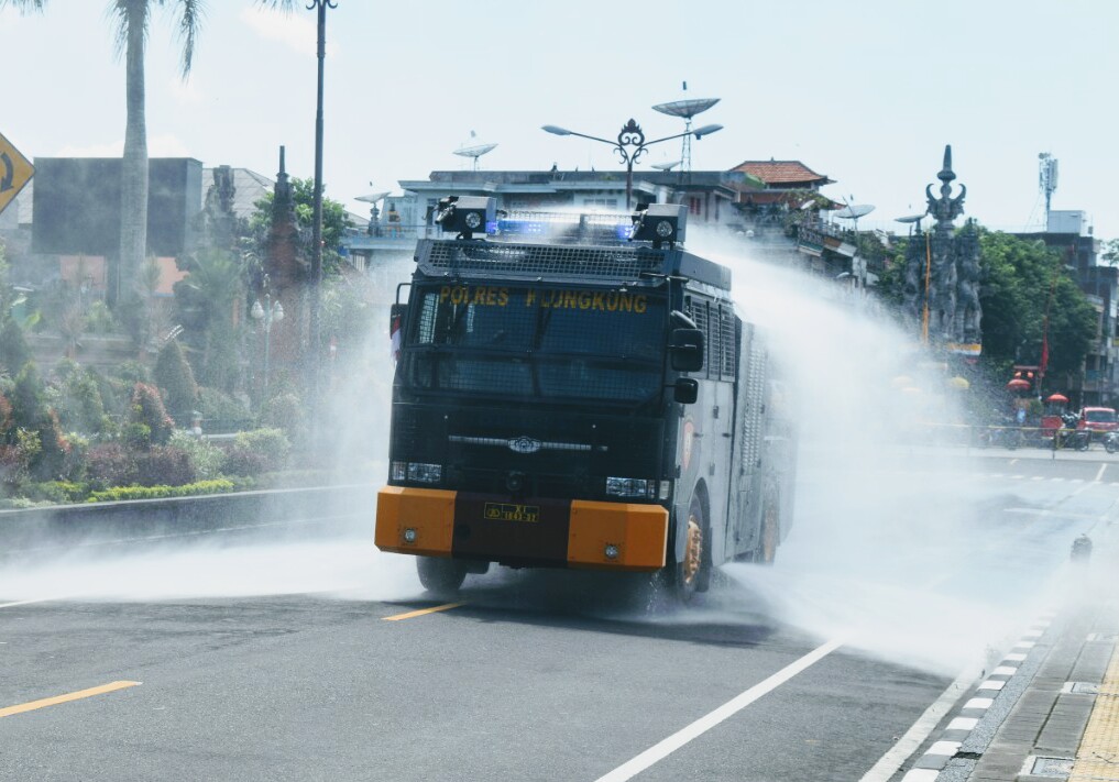 penyemprotan disinfektan memanfaatkan kendaraan Dinas Polri, seperti kendaraan watercanon, Polres Klungkung memaksimalkan titik objek yang menjadi penyemprotan, yakni di Jalan Untung surapati di mana jalan ini merupakan akses lalulalangnya Masyarakat yang Kan menuju Pasar.