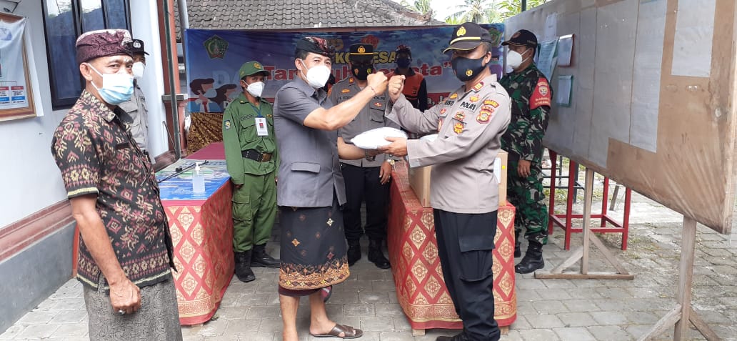 Penyerahan bantuan masker sebanyak 600 pcs diterima oleh Perbekel Desa Berambang, I Gusti Putu Supradnya selaku Ka Posko PPKM Desa Berambang disaksikan Waka Polsek Negara AKP H. Eddy Waluyo.