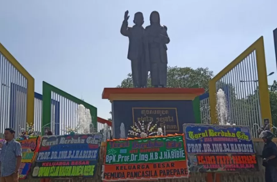 Sejumlah karangan bunga bertuliskan turut berduka cita atas meninggalnya Bacharuddin Jusuf Habibie memenuhi monumen Cinta Sejati Habibie-Ainun di jalan Bau Massepe, Kota Pare-pare, Sulawesi Selatan, Kamis (12/9/2019). FOTO/HO/Zulkifli.