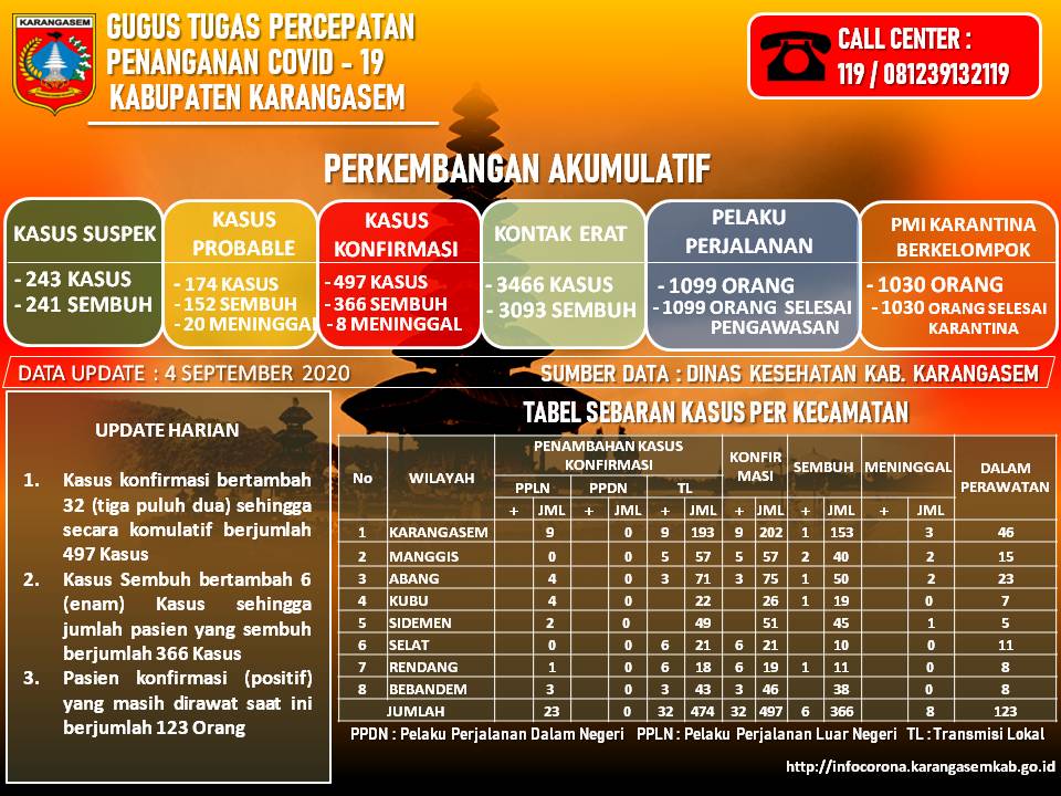 Berdasarkan laporan dari Dinas Kesehatan Kabupaten Karangasem selaku Koordinator Satuan Tugas Bidang Kesehatan Gugus Tugas Percepatan Penanggulangan Covid 19 di Kabupaten Karangasem oada hari ini Jumat, (04/09/2020) terjadi penambahan Kasus Konfirmasi sebanyak 32 kasus.