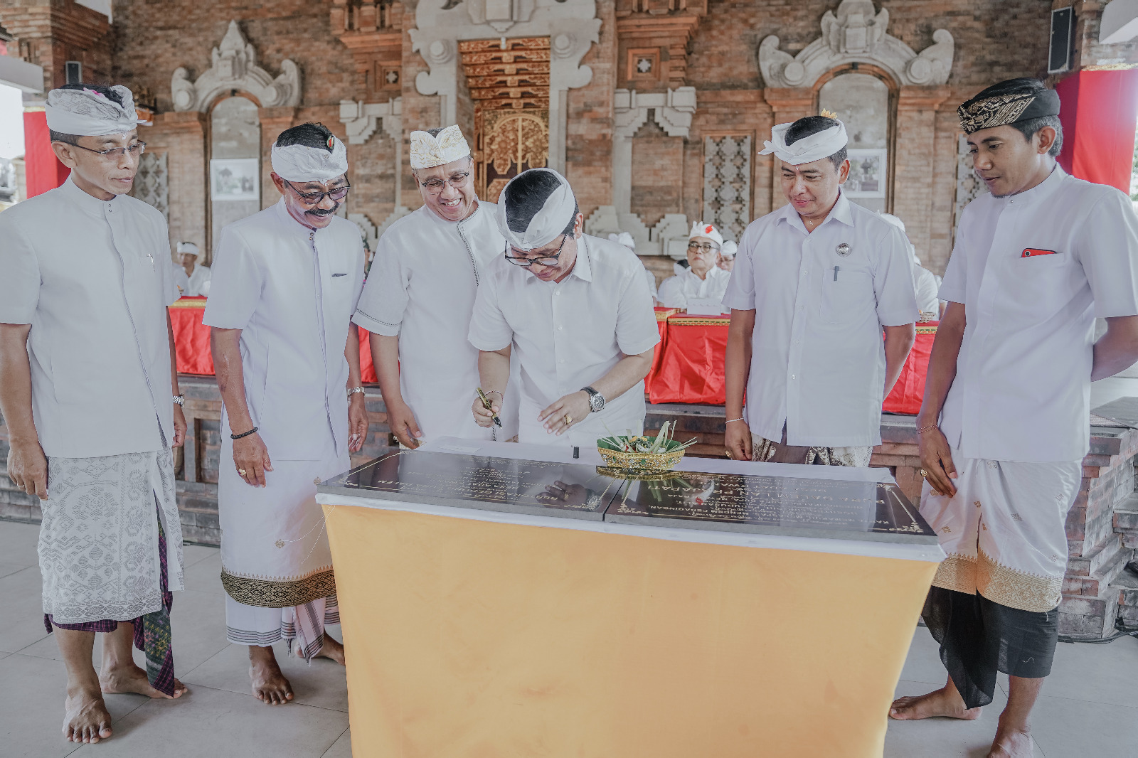Sekretaris Daerah Kabupaten Badung I Wayan Adi Arnawa mewakili Bupati Badung, menghadiri puncak Karya Melaspas, Mendem Pedagingan, Ngenteg Linggih Padudusan Alit, Wrespati Kalpa Panca Rupa Meyama Raja di Pura Dalem dan Prajapati, Desa Adat Kwanji, Sempidi, Minggu (29/1). Dalam kesempatan ini Sekda Adi Arnawa memberikan paraf di prasasti dan menyerahkan bantuan dana aci dari Pemerintah Kabupaten Badung sebesar Rp 50 juta. Karya yang dipuput oleh Ida Pedanda Gede Watulumbang Sibang ini turut dihadiri oleh Ketua DPRD Kabupaten Badung Putu Parwata, Kepala Dinas Kebudayaan Kabupaten Badung I Gde Eka Sudarwitha, Camat Mengwi Nyoman Suhartana, Tripika Kecamatan, Lurah sempidi I.G.A.K. Oka Dewi Pertiwi, Babinsa dan Bhabinkamtibmas, Bendesa Adat Sempidi, Bendesa Adat Tegal Darmasaba, Bendesa Adat Padang Luwih, Paiketan Prajuru Desa Adat Sempidi Kwanji serta tokoh masyarakat setempat.