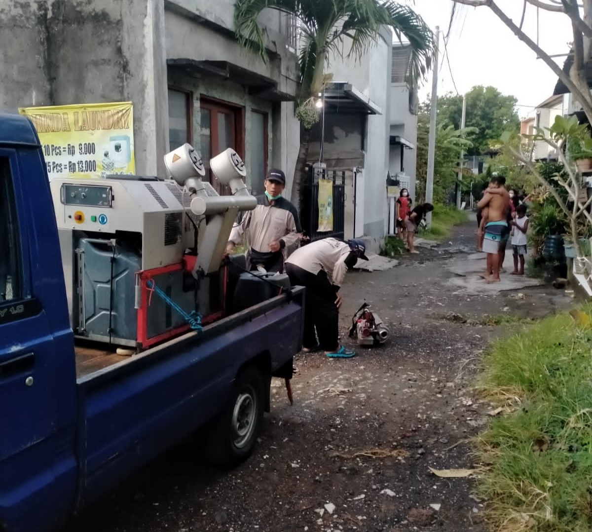 Ket. Foto :Menanggulangi penyebaran Demam Berdarah Dengue (DBD) dan Cikungunya, Kelurahan Padangsambian melaksanakan giat Fogging wilayah pada Rabu (4/5) pagi.