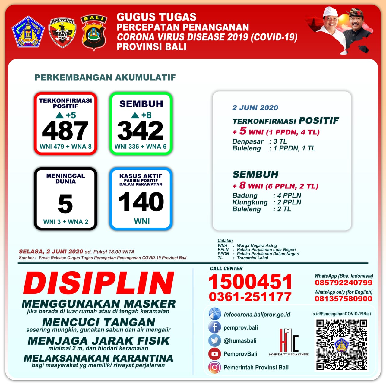 Update kasus Covid-19 hari ini. Jumlah kumulatif pasien positif 487 orang. Hari ini dilaporkan bertambah 5 orang WNI, terdiri dari 1 orang Imported Case (Indonesi) dan 4 orang Transmisi Lokal.