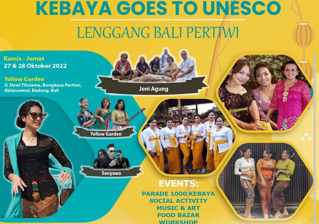 Dukungan gerakan Kebaya Goes to UNESCO semakin banyak bermunculan, kali ini Koalisi Tradisikebaya.id menyelenggarakan sebuah acara bertemakan Kebaya bertajuk Lenggang Bali Pertiwi, yang akan dihelat pada 27-28 Oktober 2022 di Yellow Garden Adventures, Bali.