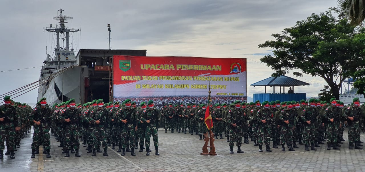Pangdam XVII/Cenderawasih yang diwakili oleh Danrem 172/PWY selaku Dankolakops Brigjen TNI Izak Pangemanan memimpin upacara penerimaan Satgas Pamtas RI-PNG yang baru di Dermaga Satuan Kapal Patroli (Satrol) Lantamal X Jayapura, Selasa (09/03/2021).
