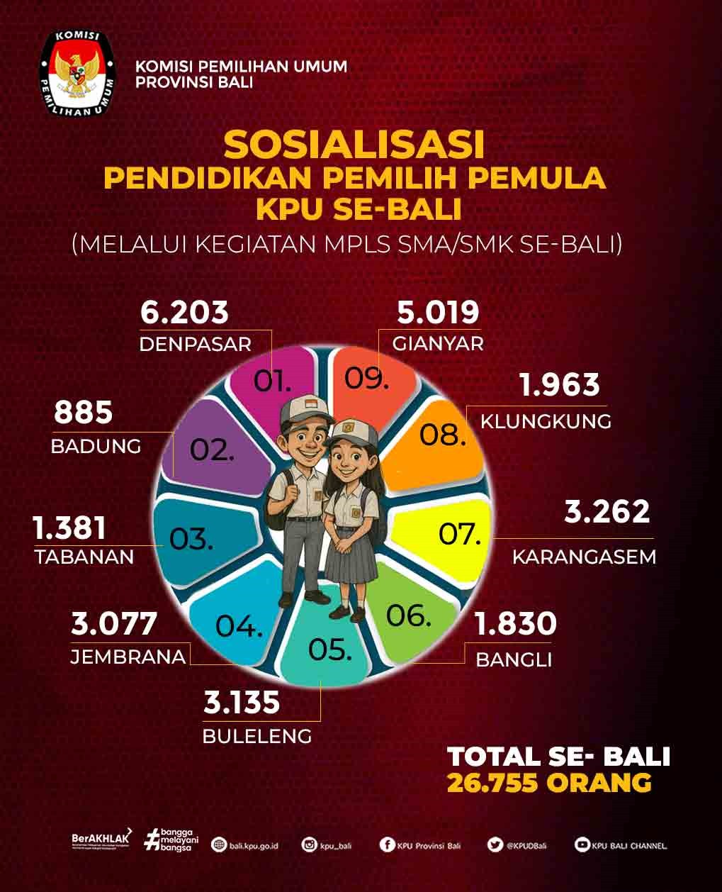 Komisi Pemilihan Umum Provinsi Bali menggelar Rapat Evaluasi Pelaksanaan Sosialisasi Pendidikan Pemilih Pemula melalui kegiatan Masa Pengenalan Lingkungan Sekolah (MPLS) di lingkungan SMA/SMK se-Bali pada Selasa, 5 Agustus 2025. Rapat yang berlangsung di ruang rapat KPU Provinsi Bali ini dihadiri oleh jajaran KPU Kabupaten/Kota se-Bali, Dinas Pendidikan Kepemudaan dan Olahraga (Disdikpora) Provinsi Bali, serta perwakilan dari Bawaslu Provinsi Bali. Rapat dibuka oleh Ketua KPU Provinsi Bali, I Dewa Agung Gede Lidartawan, didampingi oleh Anggota KPU Provinsi Bali, I Gede John Darmawan dan Luh Putu Sri Widyastini.