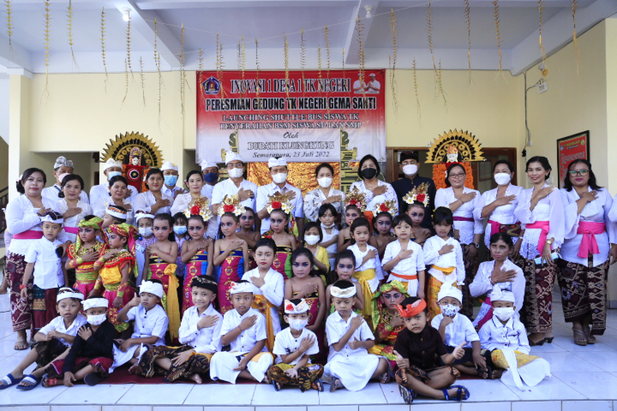 Bertepatan dengan rahina Tumpek Krulut Bupati Klungkung, I Nyoman Suwirta akhirnya meresmikan langsung Gedung TK Negeri Gema Santi di Jalan Gunung Agung No. 59 Semarapura Kangin, Sabtu (23/7). Persemian Gedung ini juga dirangkaian dengan Launching Shuttle Bus Siswa TK dan Penyerahan Bantuan Siswa Miskin (BSM) Siswa SD dan SMP. Seperti diketahui TK Negeri Gema Santi adalah salah satu wujud inovasi Satu Desa Satu TK Negeri yang digagas mulai tahun 2017 oleh Bupati Suwirta, kemudian di tahun 2018 yang semula TK Dharma Wanita Klungkung beralih status menjadi TK Negeri Gema Santi. Pembangunan fisiknya terlaksana pada akhir 2021 dengan menggunakan dana APBD sebesar Rp. 1.091.679.181,58.