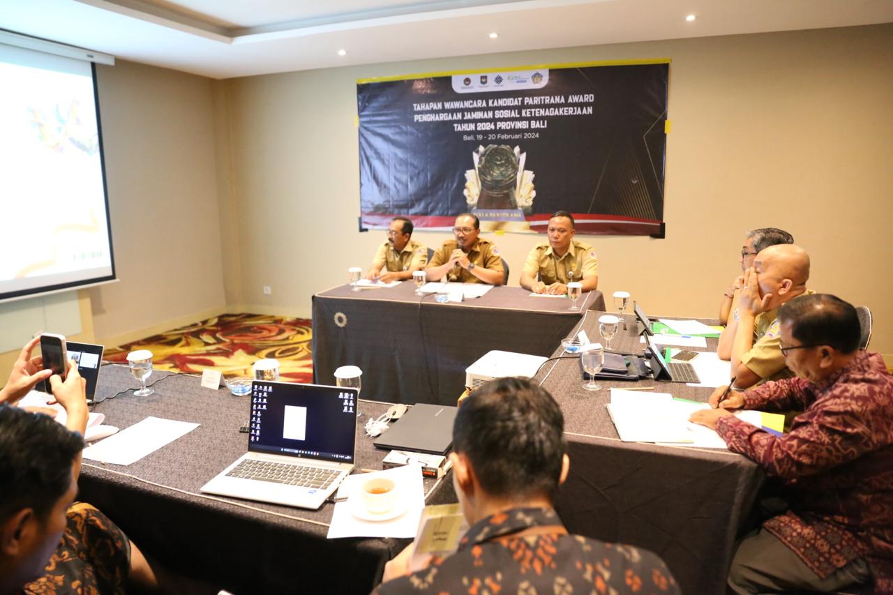 Penjabat (Pj) Bupati Klungkung, I Nyoman Jendrika mengikuti tahapan Wawancara Kandidat Paritrana Award Provinsi Bali Tahun 2024 di Four Stay by Trans Hotel, Jl. Raya Puputan No. 200 Renon, Denpasar Selatan, Senin (19/2).