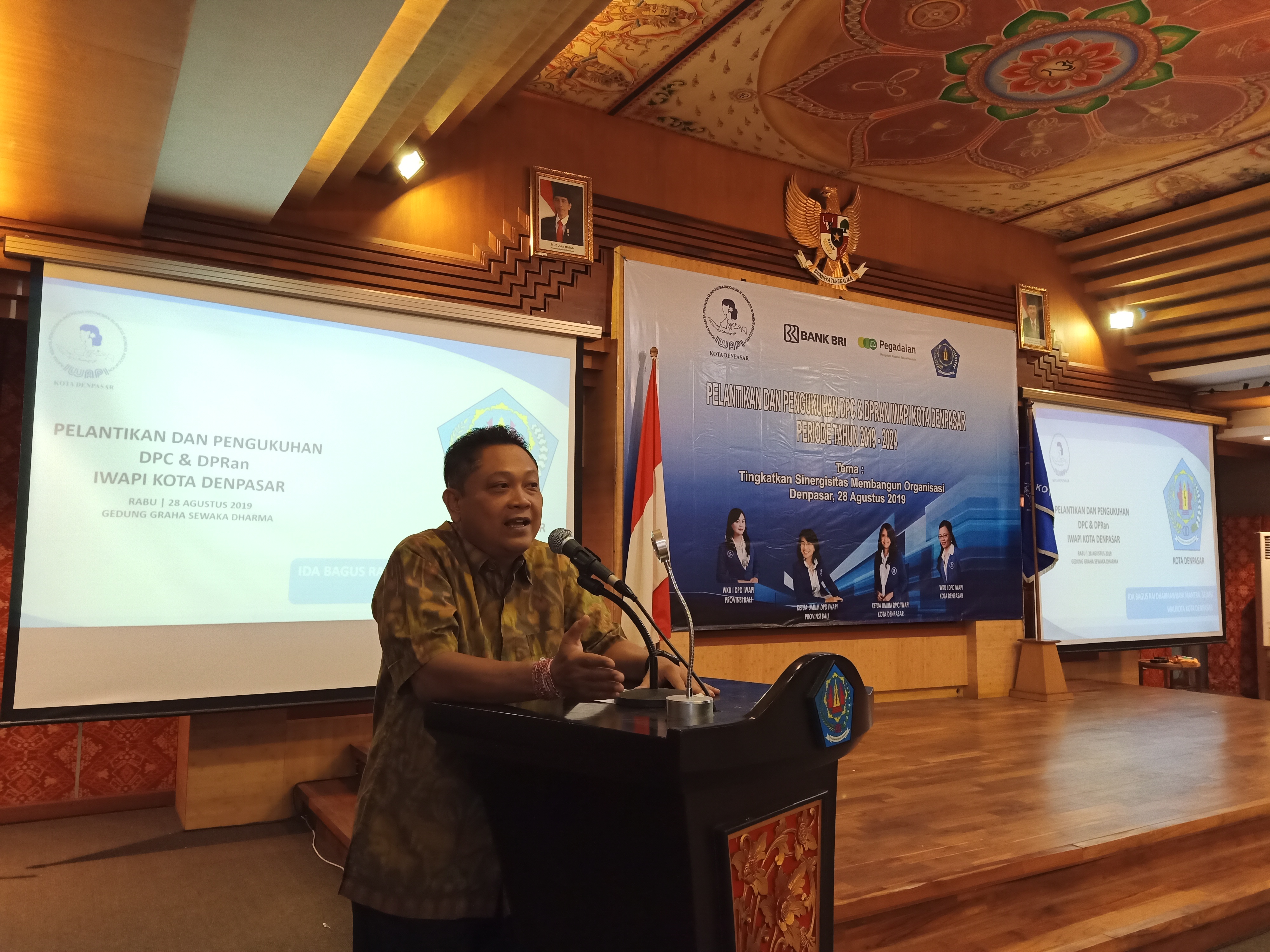 Walikota Denpasar IB Rai Dharmawijaya Mantra didampingi Sekda Kota Denpasar AAN Rai Iswara dan Dewan Pembina IWAPI Kota Denpasar, Ny. IA. Selly Dharmawijaya Mantra menghadiri acara Pelantikan dan Pengukuhan DPC dan DPRan (Dewan Pengurus Ranting) IWAPI Kota Denpasar periode 2019-20124, di Graha Sewaka Dharma, Rabu (28/8). Nampak hadir pula pengurus IWAPI se-Bali, dan Camat Se-Kota Denpasar. Dalam kesempatan tersebut Walikota Denpasar, IB Rai Dharmawijaya Mantra mengatakan selamat dan tetap semangat menjalankan tugas dan fungsi kedepannya. Rai Mantra juga berpesan, pemerdayaan masyarakat khususnya dalam meningkatkan jiwa kewirausahaan di masyarakat harus ditingkatkan. “IWAPI memiliki peran strategis untuk membantu dan bersinergi dengan pemerintah, UKM, komunitas dan organisasi masyarakat lainnya,” kata Rai Mantra.
