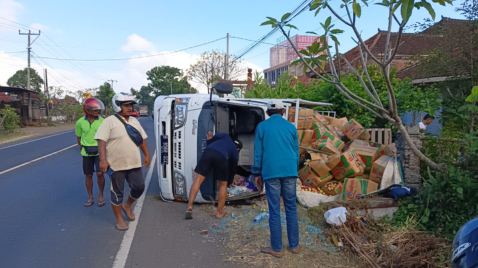 Kecelakaan lalu lintas tunggal terjadi di jalur Denpasar-Gilimanuk, Jumat (28/7/2023) pagi. Truk bermuatan apel terguling di jalan utama KM 100-101 di Desa Banyubiru, Kecamatan Negara.