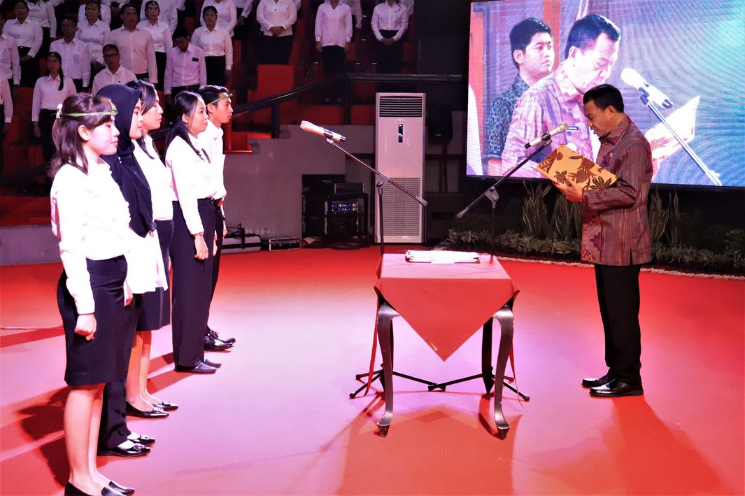 Pelantikan dan pengambilan sumpah dilakukan di Gedung Kesenian Gede Manik Singaraja, Jumat (18/8). Kegiatan ini dihadiri pula oleh Sekretaris Daerah (Sekda) Gede Suyasa yang juga selaku Ketua Panitia Pengadaan Aparatur Sipil Negara (ASN) Kabupaten Buleleng dan pimpinan perangkat daerah lainnya.