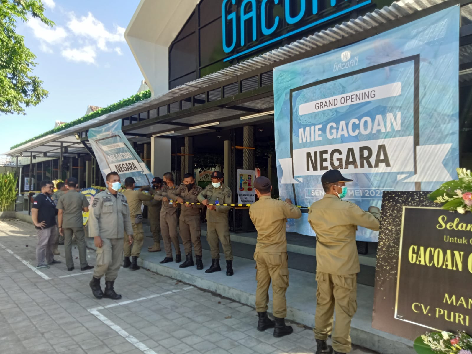 Penyegelan dengan memasang garis polisi (police line) di bagian depan bangunan bersamaan dengan launching perdana outlet Mi Gacoan Cabang Negara.