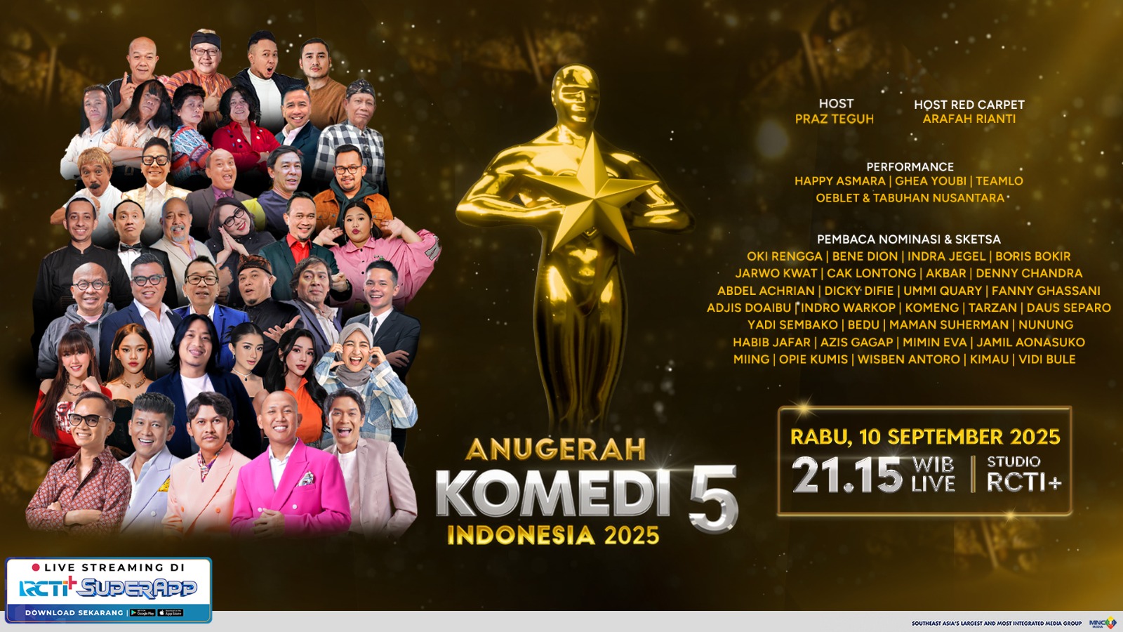 Tak hanya itu, Deretan bintang komedi ternama akan tampil dalam acara ini, di antaranya: Oki Rengga, Bene Dion, Indra Jegel, Boris Bokir, Jarwo Kwat, Cak Lontong, Akbar, Denny Chandra, Abdel Achrian, Dicky Difie, Ummi Quary, Fanny Ghassani, Indro Warkop, Komeng, Tarzan, Daus Separo, Yadi Sembako, Bedu, Maman Suherman, Nunung, Habib Jafar, Aziz Gagap, Mimin Eva, Jamil Aonasuko, Mi’ing, Opie Kumis, Wisben Antoro, Kimau dan Vidi Bule.