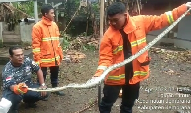 Petugas Damkar (Pemadam Kebakaran) pada Sat Pol PP Kabupaten Jembrana menangkap ular sanca dengan panjang sekitar 2 meter, Minggu (2/4/2023) pagi.