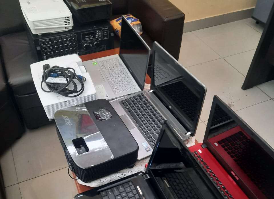 Keterangan foto: Barang bukti berupa 1 unit Ampliplyer, 4 unit LCD proyektor berbagai merk, 4 unit Laptop berbagai merk/BN