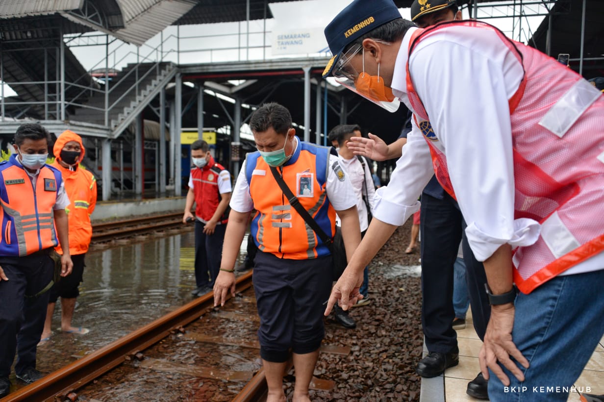Usai meninjau kondisi Bandara Ahmad Yani, Menteri Perhubungan (Menhub) Budi Karya Sumadi bersama Gubernur Jawa Tengah Ganjar Pranowo meninjau kondisi Stasiun Kereta Api Tawang yang masih belum bisa beroperasi karena stasiun dan jalur kereta api yang masih tergenang air.