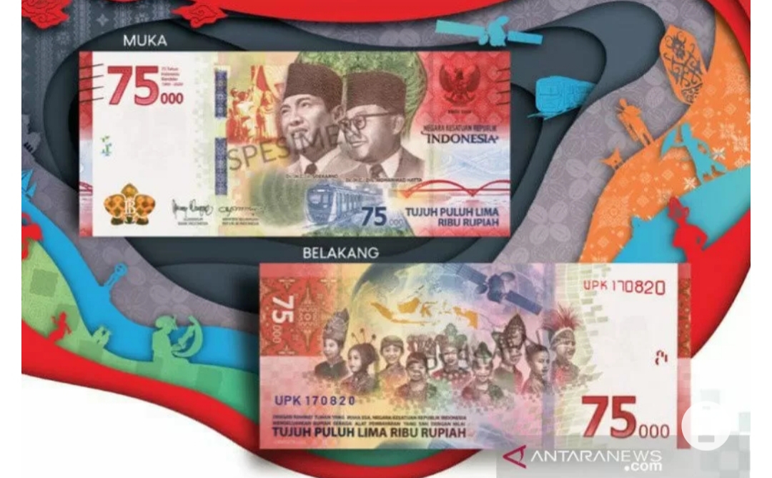Menteri Keuangan Sri Mulyani Indrawati dan Gubernur Bank Indonesia (BI) Perry Warjiyo meresmikan secara virtual uang kertas rupiah khusus pecahan 75.000 sebanyak 75 juta lembar untuk memperingati HUT ke-75 Republik Indonesia.