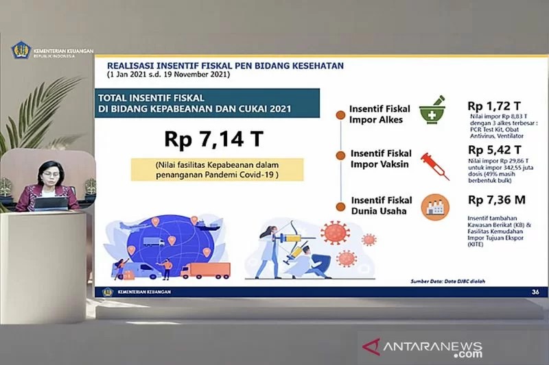 Menteri Keuangan (Menkeu) Sri Mulyani menyebutkan realisasi insentif fiskal program pemulihan ekonomi nasional (PEN) bidang kesehatan melalui kepabeanan dan cukai mencapai Rp7,14 triliun sejak 1 Januari hingga 19 November 2021.