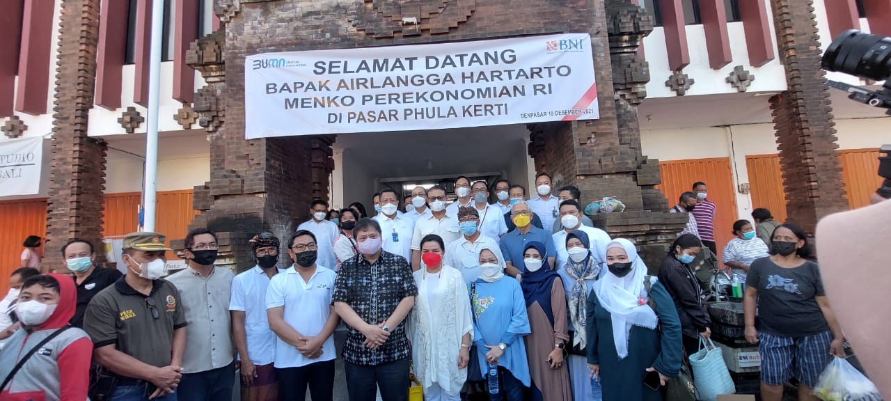 Foto: Menteri Perekonomian Airlangga Hartarto berfoto bersama penerima KUR di sela-sela mengunjungi Pasar Rakyat Phula Kerti di Denpasar, Bali, Sabtu (18/12/2021).