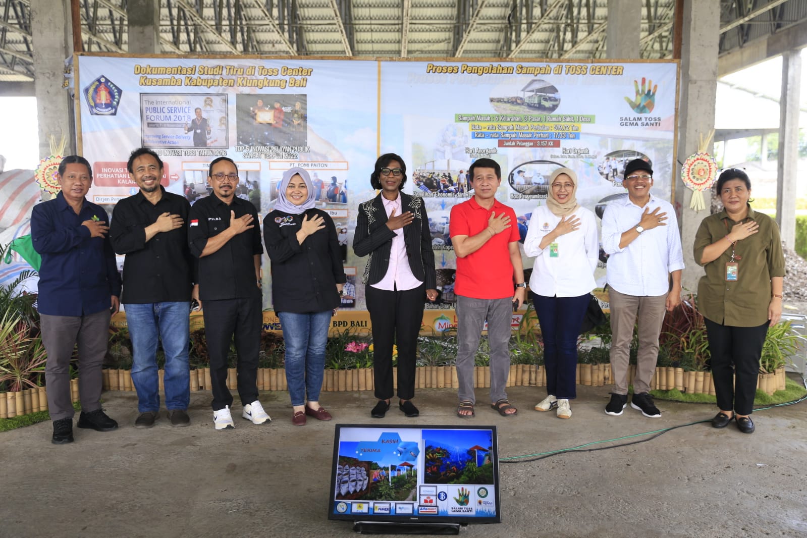 Melirik berhasilan Tempat Olah Sampat Setempat (TOSS) yang masuk TOP 5 Inovasi Pelayanan Publik sangat Terpuji 2022. Menteri Lingkungan dan Pembangunan Berkelanjutan Republik Kongo, Arlette Soudan Nonault mengunjungi Tempat Olah Sampat Setempat (TOSS) Gema Santi di Desa Kusamba, Kecamatan Dawan, Klungkung, Minggu (26/3).