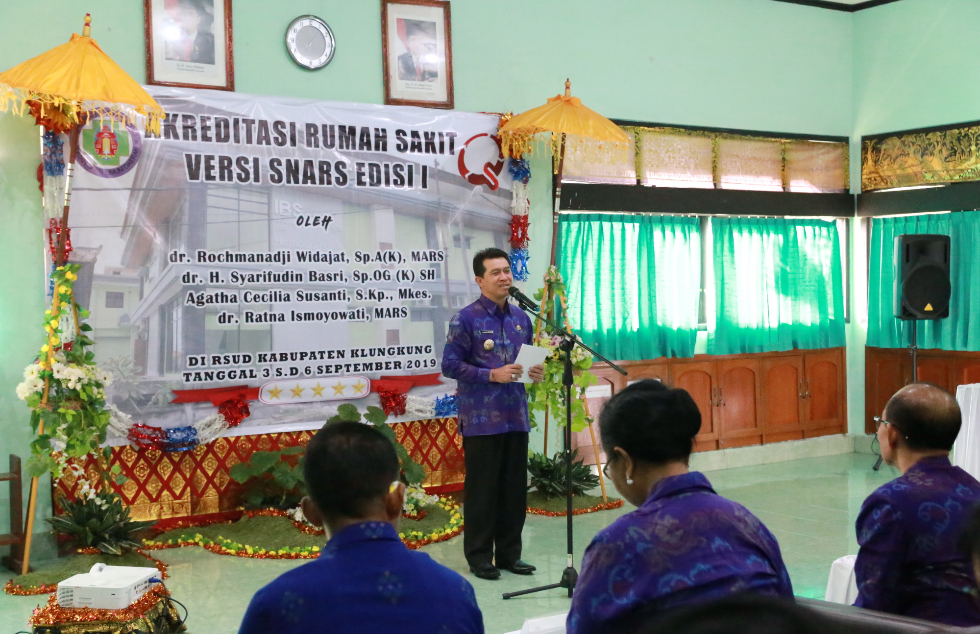 Rumah Sakit Daerah (RSUD) Klungkung terus berkomitmen untuk meningkatkan mutu kualitas pelayanannya. Salah satunya dengan kedatangan Tim Surveyor  Komite Akreditasi Rumah Sakit dalam rangka penerapan Standar Nasional Akreditasi Rumah Sakit (SNARS) Edisi I di Rumah Sakit Daerah Kabupaten Klungklung. Kedatangan tim SNARS yang dipimpin dr. Rochmanadji Widajat, Sp. A(K), MARS disambut Bupati Klungkung I Nyoman Suwirta didampingi Direktur RSUD Klungkung dr. I Nyoman Kesuma beserta jajarannya, Selasa (3/9).
