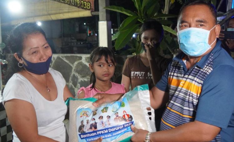 Tidak hanya monitoring PPKM Darurat , kali ini Bupati berserta jajaran Forkopimda sekaligus menyerahkan bantuan berupa beras bagi pedagang-pedagang kecil yang terdampak pemberlakuan PPKM Darurat . Bantuan beras itu bersumber dari CSR perusahaan yang bergerak di sektor perikanan di Jembrana.