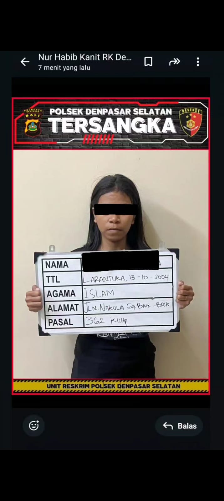 Menindaklanjuti laporan dengan nomor LP-B/60/IV/2025/SPKT/SEK DENSEL, tim Opsnal Unit Reskrim Polsek Denpasar Selatan melakukan penyelidikan dan berhasil mengidentifikasi pelaku, yang ternyata adalah teman dekat korban sendiri berinisial RH (20), asal Larantuka, yang masih berstatus mahasiswi.