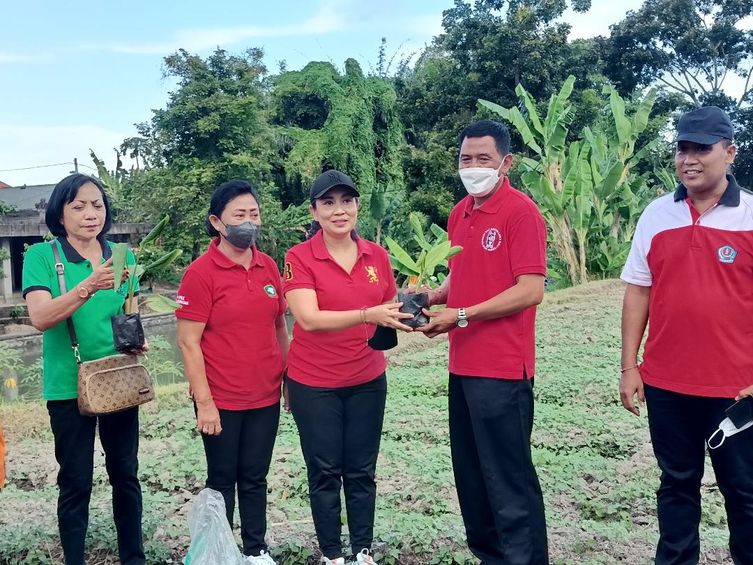 Istri Wakil Walikota, Ny. Ayu Kristi Arya Wibawa didampingi Ketua DWP Kota Denpasar, Ny. Ida Ayu Widnyani Wiradana melaksanakan penyerahan bibit serta penanaman pohon serangkaian Pelatihan Nasional Adaptasi Perubahan Iklim yang digelar oleh Global Covenant of Mayors for Climate and Energy (GCoM) berlokasi di Tukad Rarangan, Desa Peguyangan Kaja, Rabu (25/5).