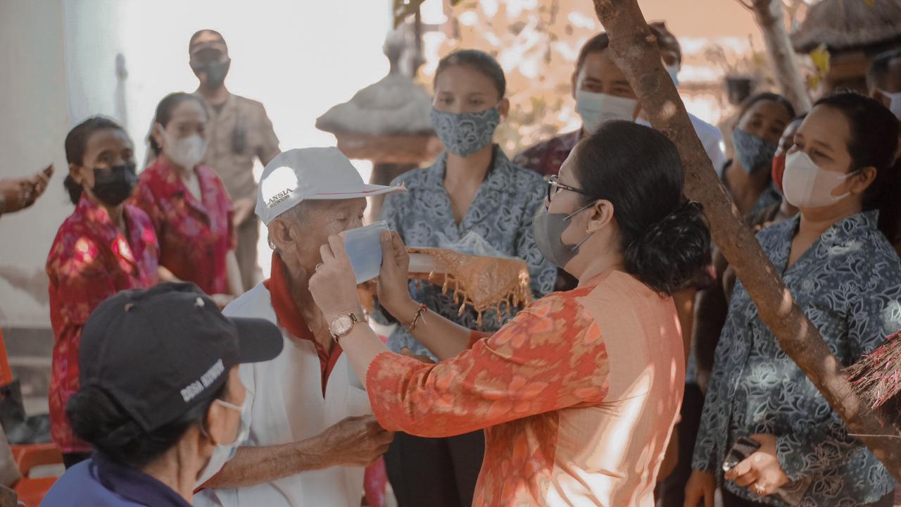 Selain meninjau perkembangan Hatinya PKK, Wakil Ketua TP. PKK Kabupaten Badung Ny. Kristiani Suiasa juga menyerahkan bantuan sembako dan masker kepada balita, lansia dan disabilitas yang berada di Desa Kuwum, Kecamatan Mengwi.