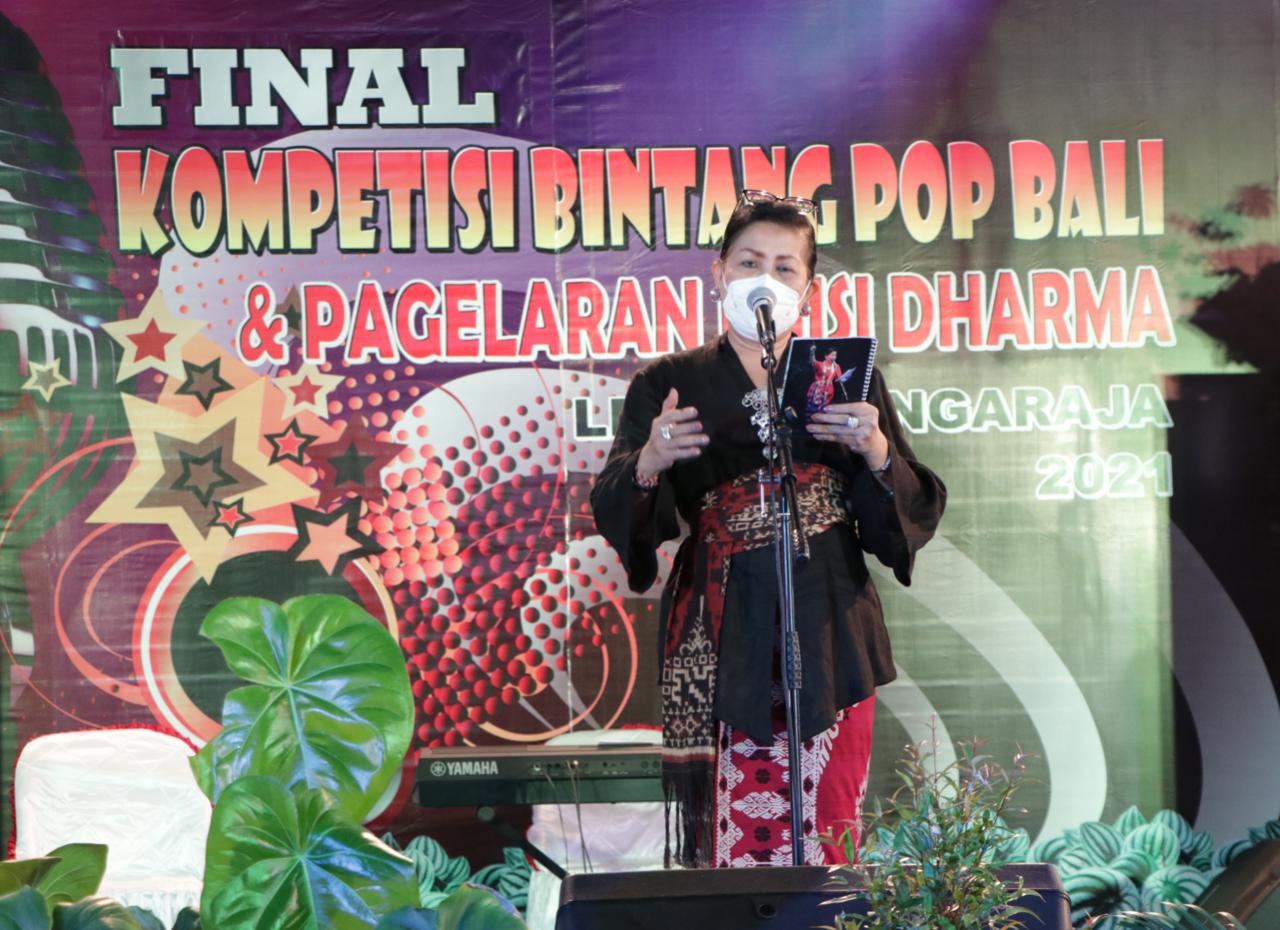 Kegiatan yang berlangsung live ini dimeriahkan oleh kehadiran seniman senior multitalenta Ny Putri Suastini Koster. Pada kesempatan ini, Ny Putri Koster menyampaikan agar kompetisi seperti ini semakin banyak digalakkan untuk menumbuhkan daya saing kreativitas remaja agar senantiasa lahir generasi muda yang penuh kreativitas, sehingga ke depannya mampu memancarkan cahaya bagai bintang. “Mari tetap kita wadahi semangat seni generasi muda agar nantinya akan tumbuh menjadi embrio yang mapan di masa yang akan datang,” tegas Ny Putri Suastini Koster saat menghadiri sekaligus membacakan puisi pada acara final kompetisi bintang pop Bali dan pagelaran puisi dharma serangkaian perayaan hari kelahiran ke-417 Kota Singaraja dan perayaan hari Nyepi Caka 1943 tahun 2021, di Wantilan RRI Singaraja, Sabtu (27/3).