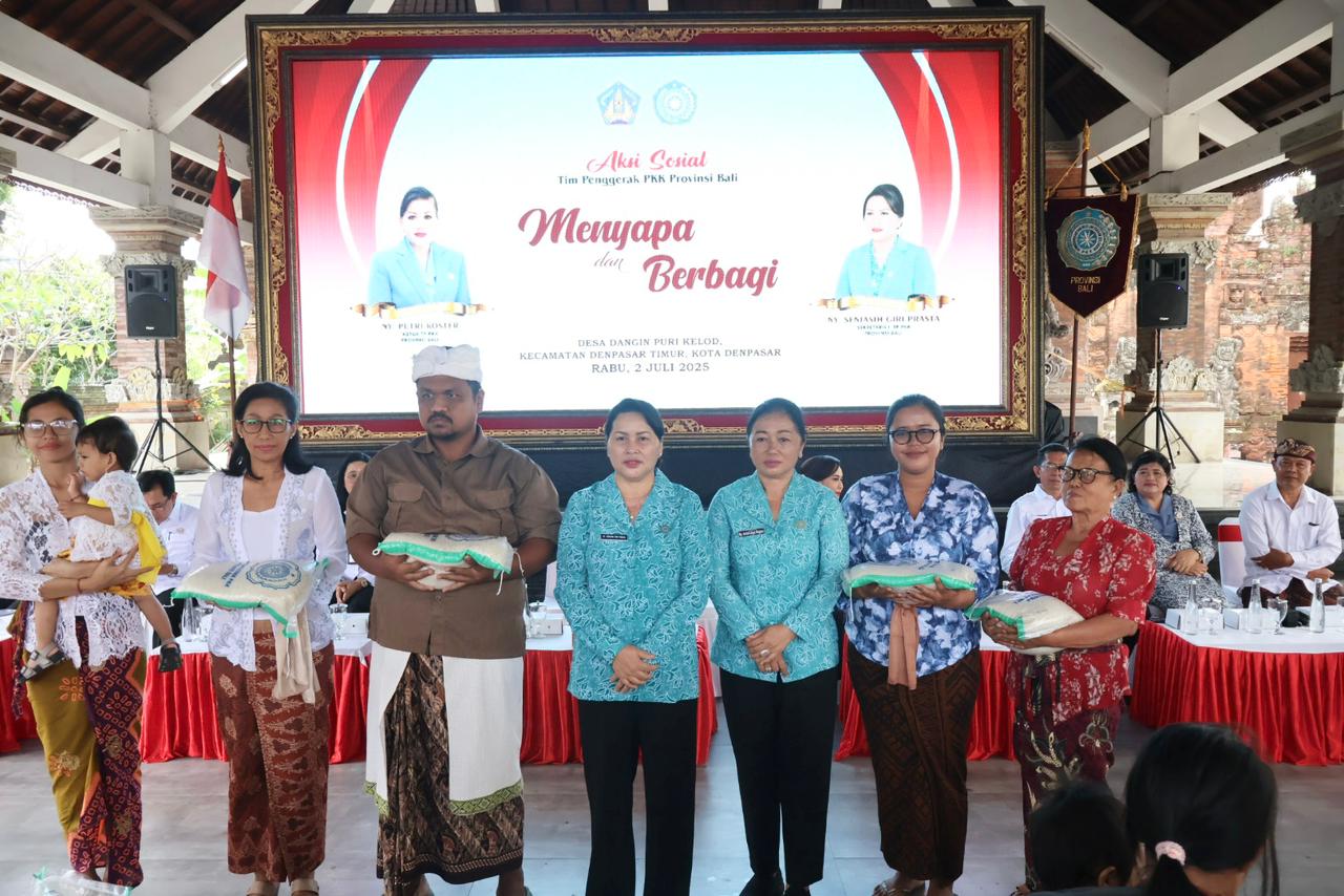 Sekretaris I TP PKK Provinsi Bali, Ny. Seniasih Giri Prasta, mewakili Ketua TP PKK Provinsi Bali, berkesempatan menyapa warga Denpasar dalam kegiatan Aksi Sosial TP PKK Provinsi Bali Menyapa dan Berbagi yang berlangsung di Wantilan Pura Dalem Nyanggelan, Desa Adat Yangbatu, Denpasar Timur, pada Rabu (2/7).