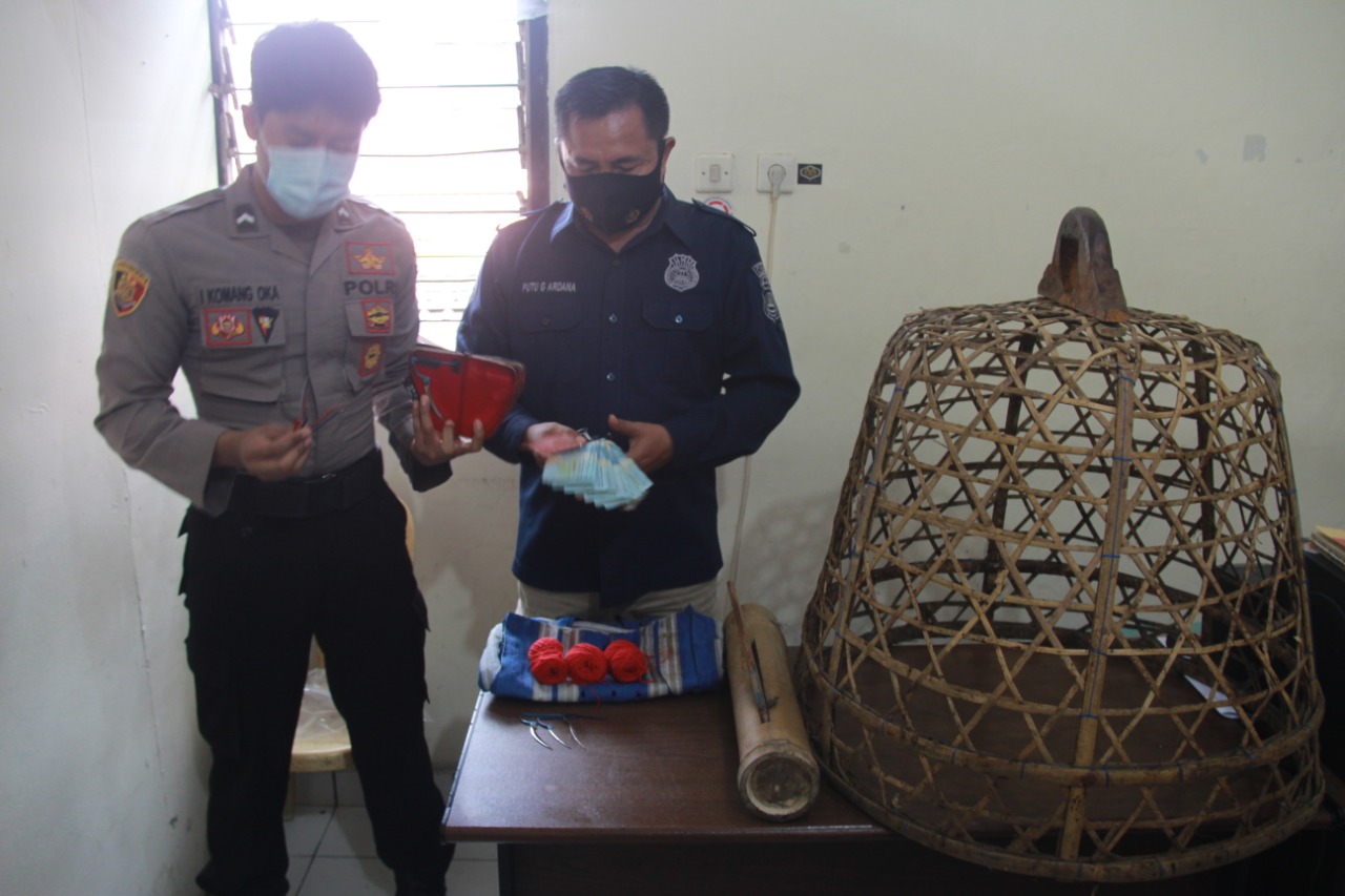 Kasubbag Humas Polres Klungkung Akp  I Putu Gede Ardana, S.H., atas izin Kapolres Klungkung AKBP Bima Aria Viyasa,S.I.K.,M.H., didampingi Penyidik Sat Reskrim Polres Klungkung Bripda I Komang Oka, saat press release satuan reserse kriminal berhasil mengungkap kasus judi sabung ayam / judi tajen yang bertempat di Wantilan Pura Dalem Desa Getakan Kecamatan Banjarangkan Klungkung.