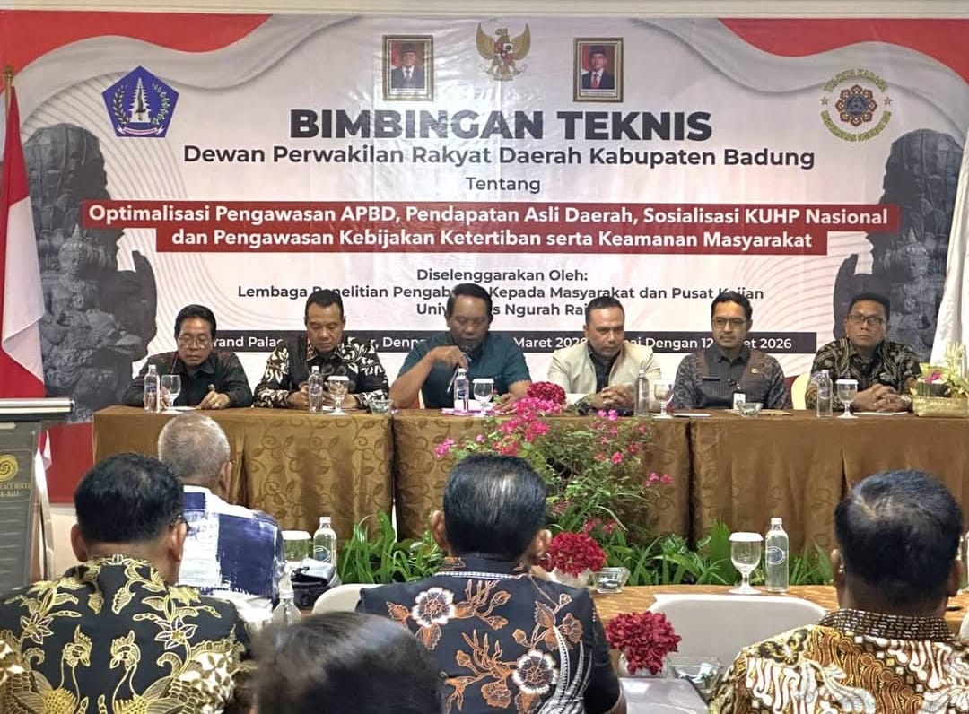 Seluruh pimpinan dan anggota DPRD Badung yang berjumlah 45 orang mengikuti bimbingan teknis (bimtek) selama empat hari mulai Senin hingga Kamis (9-12 Maret 2026). Bimtek digelar di Grand Palace Hotel Sanur, Denpasar. Terkait materi bimtek, Sekretaris DPRD Badung I Gde Surya Kurniawan (10/3/2026) menyatakan, ada empat topik yakni Optimalisasi Pengawasan APBD, Pendapatan Asli Daerah (PAD), Sosialisasi KUHP Nasional, dan Pengawasan Kebijakan Ketertiban serta Keamanan Masyarakat. “Empat topik ini menjadi materi bimtek”.