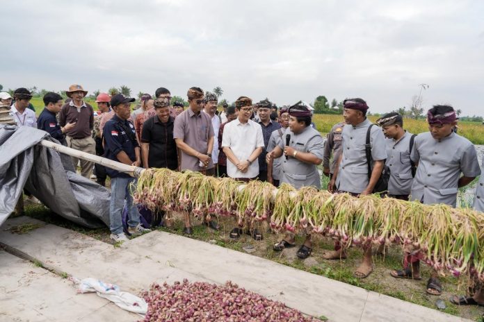 Bupati Wayan Adi Arnawa saat menghadiri Kegiatan Panen Perdana Pengembangan Bawang Merah di Subak Padedekan, Desa Angantaka, Abiansemal, Selasa, (19/8).
