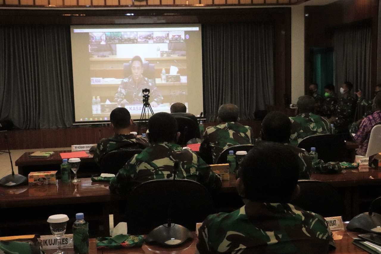 Pangdam XVII/Cenderawasih Mayjen TNI Ignatius Yogo Triyono, M.A. bersama para orang tua dari peserta Calon Siswa Tamtama PK TNI AD Gel I Tahun 2021 mendengarkan arahan dari Kepala Staf Angkatan Darat (Kasad) Jenderal TNI Andika Perkasa terkait pelaksanaan tes Werving melalui Video Conference, di Ruang Bina Yudha Makodam XVII/Cenderawasih, Jayapura, Jumat (9/4/2021).
