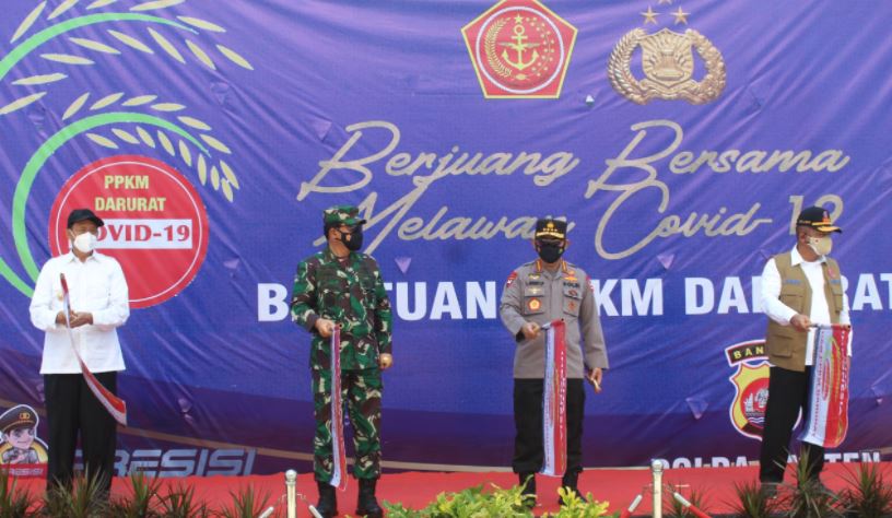 Panglima TNI Marsekal Hadi Tjahjanto bersama Kapolri Jendral Polisi Listyo Sigit Prabowo dan Kepala BNPB Ganip Warsito melepas rombongan pengantar bantuan PPKM Darurat di Kampus Untirta. Minggu, (18/07/2021).