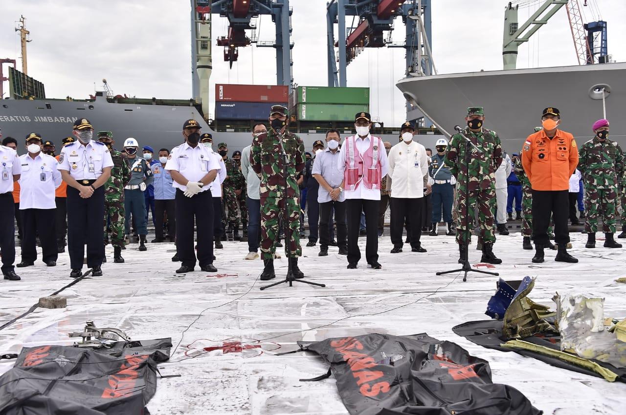 Panglima TNI Marsekal TNI Hadi Tjahjanto, S.I.P. bersama Menteri Perhubungan (Menhub) Budi Karya Sumadi, Kepala Staf Angkatan Laut (Kasal) Laksamana TNI Yudo Margono, S.E., M.M., Kepala Badan Nasional Pencarian dan Pertolongan (Kabasarnas) Marsdya TNI Bagus Puruhito dan Ketua Komite Nasional Keselamatan Transportasi (KNKT) Soerjanto Tjahjono, menggelar konferensi pers terkait ditemukannya Flight Data Recorder (FDR) pesawat Sriwijaya Air SJ-182, bertempat di Dermaga JICT II, Tanjung Priok, Jakarta Utara, Selasa (12/1/2021).