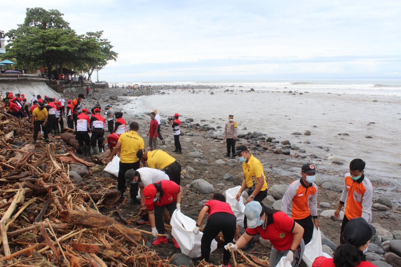Personil Polres Jembrana bersama warga, Minggu (17/1) membersihkan tumpukan sampah di Pantai Medewi, Desa Medewi, Kecamatan Pekutatan. Pasalnya, pasca banding bandang Kamis (15/1) lalu sepanjang Pantai Medewi dipenuhi sampah.