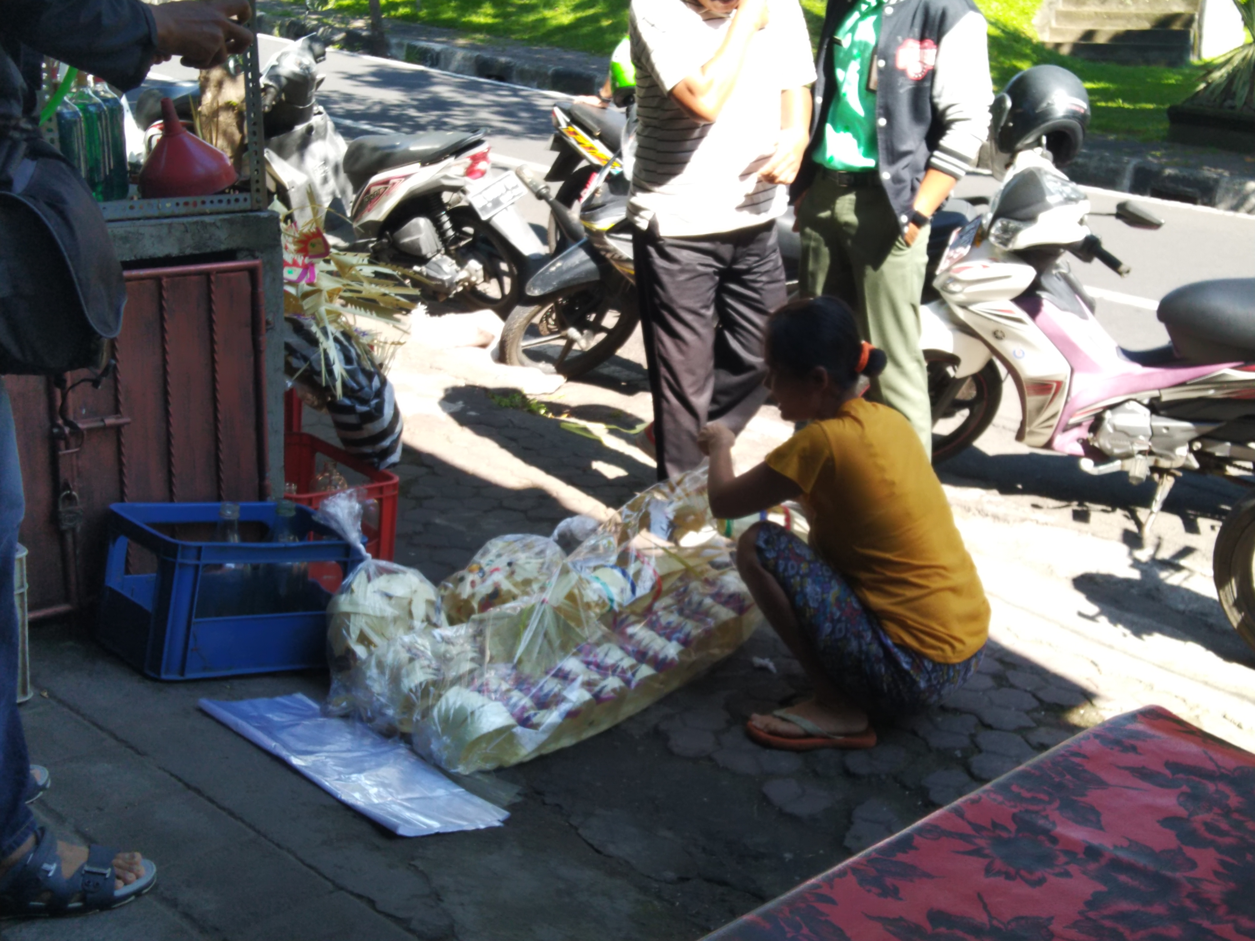 “Untuk satu paket penjor plus bamboo dan sanggahnya kita jual Rp, 225 ribu, tetapi kita juga jual ecer disini,” terang Nyoman Simpen saat ditemui media ini.