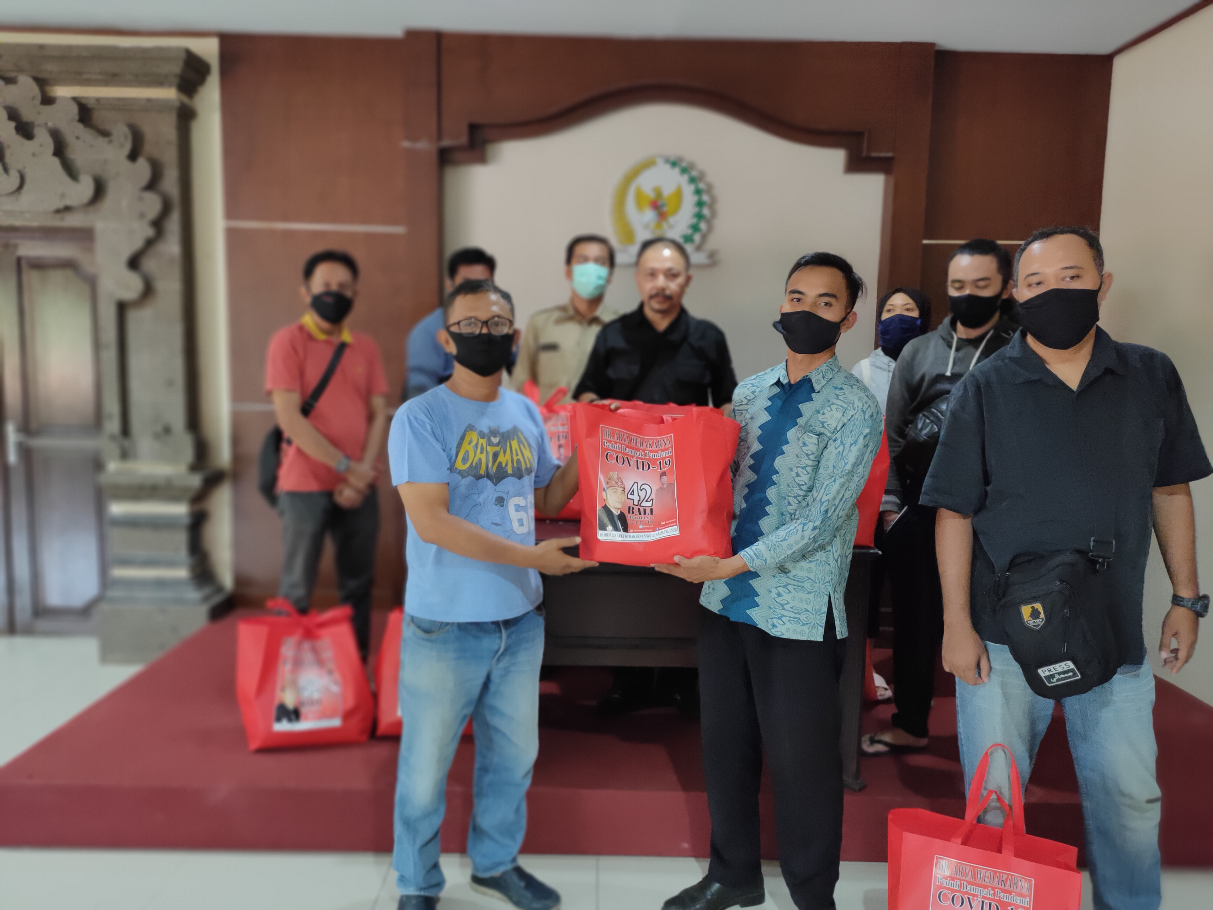 Peduli Covid-19, Anggota DPD (Dewan Perwakilan Daerah) RI daerah pemilihan Bali, Shri I Gusti Ngurah Arya Wedakarna Mahendradatta Wedasteraputra Suyasa yang kerap disapa AWK menyerahkan bantuan sembako kepada kalangan wartawan, Rabu (27/5/2020) di kantor Sekretariat DPD Renon Denpasar.