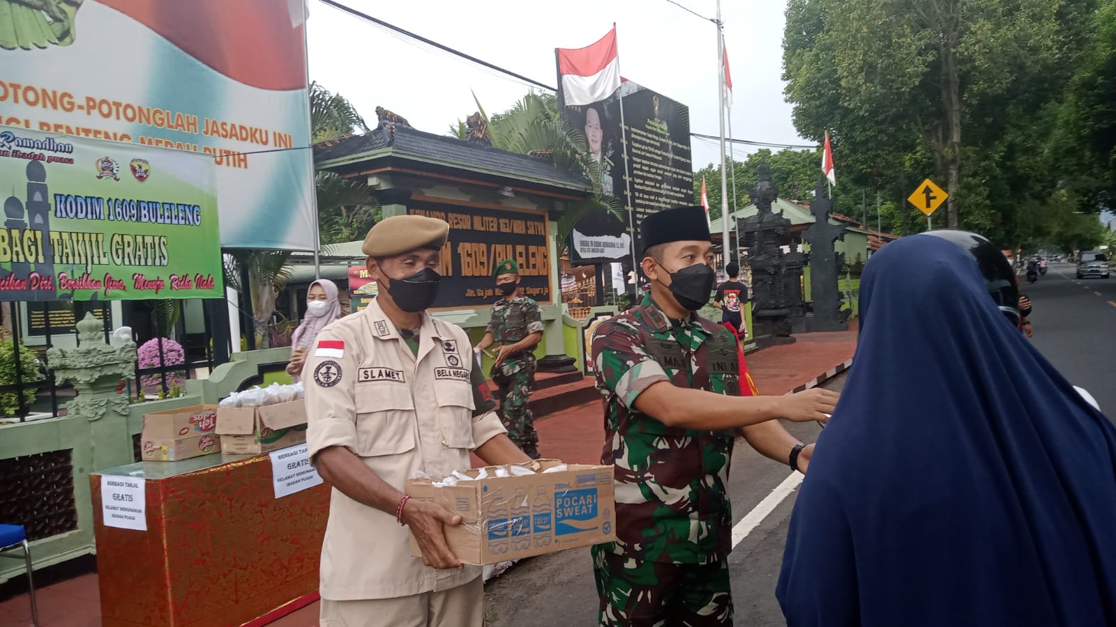 Peduli kasih dibulan ramadhan dilakukan Kodim 1609/Buleleng dan jajaran Koramil di sembilan kecamatan se Kabupaten Buleleng. Seperti yang terjadi pada Minggu, 17 April 2022 sekitar Pukul 17.30 Wita di depan Makodim 1609/Buleleng, Jln. Gajah Mada, No. 142, Kelurahan Banjar Jawa, Singaraja. Dimana Dandim 1609/Buleleng, Letkol Arh Tamaji, S.Sos.,M.I.Pol, melaksanakan kegiatan ‘Berbagi Takjil Gratis’ kepada warga masyarakat, berupa paket nasi kotak, kolak dan air mineral sebagai pembatal puasa untuk masyarakat yang melintas di depan Makodim, baik menggunakan kendaraan maupun pejalan kaki.