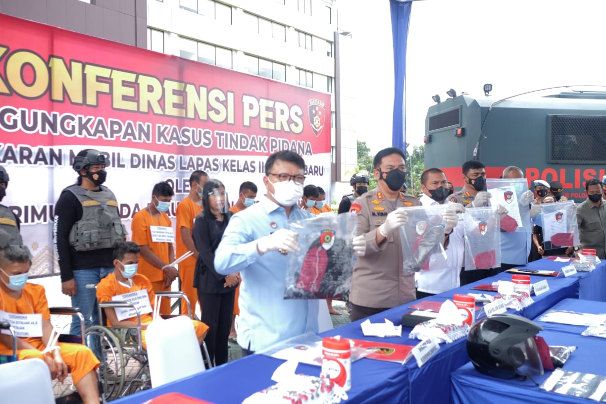 Tim gabungan Kantor Wilayah (Kanwil) Kementerian Hukum dan Hak Asasi Manusia (Kemenkumham) Riau, Lembaga Pemasyarakatan (Lapas) Kelas IIA Pekanbaru, dan Direktorat Reserse Umum (Ditreskrimum) Kepolisian Daerah (Polda) Riau menggelar konferensi pers pengungkapan kasus tindak pidana pembakaran mobil dinas Lapas Kelas IIA Pekanbaru, Selasa (25/1). Sebelumnya, tim telah mengamankan para pelaku pembakaran mobil dinas Kepala Kesatuan Pengamanan Lapas Kelas IIA Pekanbaru, termasuk satu di antaranya yakni narapidana kasus narkoba yang mendekam di Lapas tersebut.