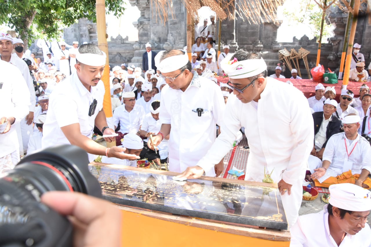 Penandatanganan Prasasti Pembangunan Pura Payogan Agung dan Pura Taman Beji Segara Rupek oleh Gubernur Bali Wayan Koster bersama Pengerajeg Karya IGN Jaya Negara, pada Selasa (28/6).