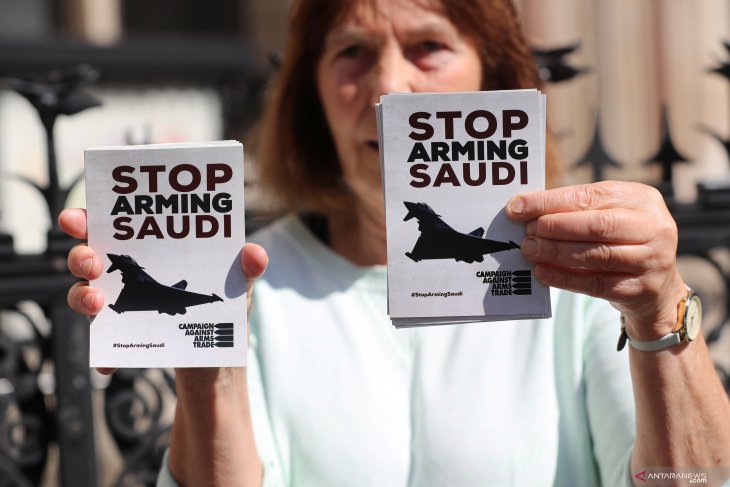 Aktivis berunjuk rasa di luar gedung Pengadilan Tinggi terkait putusan pengadilan tentang keputusan pemerintah Inggris memberikan lisensi untuk ekspor senjata ke Arab Saudi di London, Inggris, Kamis (20/6/2019). Pengadilan Inggris pada hari Kamis (20/6/2019) memutuskan bahwa pemerintah Inggris telah bertindak tidak sah dalam mengizinkan ekspor senjata ke Arab Saudi yang mungkin telah digunakan dalam konflik di Yaman. ANTARA FOTO/REUTERS/Simon Dawson/wsj.