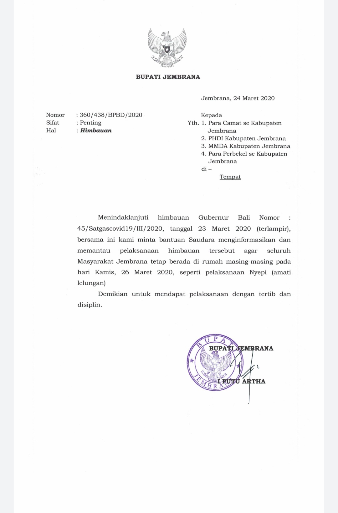 Keputusan ini tertuang dalam surat himbauan nomor 360/438/BPBD/ 2020 yang ditandatangani Bupati Jembrana I Putu Artha. Himbauan Bupati Jembrana ini sekaligus mempertegas Surat Gubernur bali nomor : 45/Satgascovid19/III/2020, terkait himbauan tidak bepergian saat Ngembak Geni. Selain itu, himbauan ini juga berdasarkan arahan Presiden RI melalui pidato tanggal 15 Maret 2020 tentang perkembangan penyebaran penyakit virus Corona (Covid 19) di Indonesia.