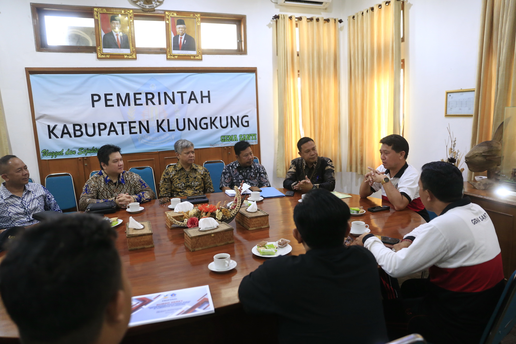 Bupati Klungkung, I Nyoman Suwirta menerima bantuan dana Rumah Deret Pemberdayaan Masyarakat Sosial Dalam Pengentasan Kemiskinan dari Plt Direktorat Jenderal Perlindungan dan Jaminan Sosial, Faisal di ruang rapat Kantor Bupati Klungkung, Jumat (24/2). Rencananya bantuan rumah deret senilai Rp. 3.060.000.000 dengan luas lahan 22.470 m2 akan dibangun di Desa Sulang, Kecamatan Dawan dengan 36 unit dan diprioritaskan kepada masyarakat KK miskin yang termasuk dalam Data Terpadu Kesejahteraan Sosial (DTKS).