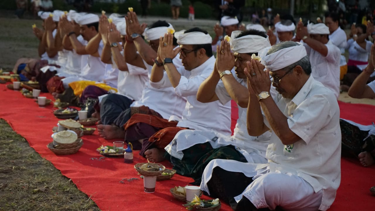 Keterangan foto: Wakil Walikota Kota Denpasar IGN Jaya Negara saat bersembahyang bersama pada Piodalan Tumpek Krulut di Lapangan Puputan Badung Gusti Ngurah Made Agung Sabtu (7/9)