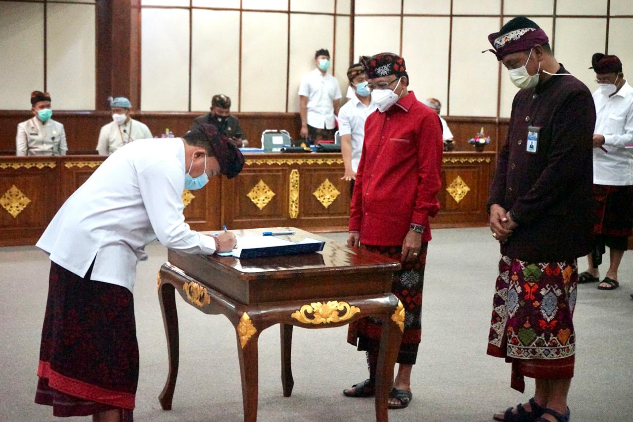 Pemerintah Kota Denpasar menerima Daftar Isian Pelaksanaan Anggaran (DIPA) Tahun 2021 dan Daftar Alokasi Dana Transfer ke Daerah dan Dana Desa (TKDD) yang diserahkan Gubernur Bali, Wayan Koster dan diterima langsung Pj. Sekda Kota Denpasar, I Made Toya bersama Sembilan Kabupaten dan Kementerian/Lembaga lainya di Bali, Selasa (26/11) di Gedung Wiswa Sabha Utama Kantor Gubernur Bali.