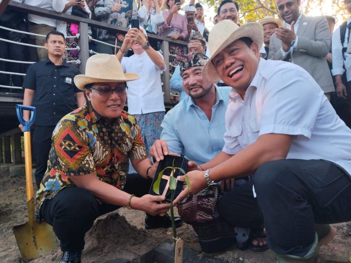 Pj. Gubernur Bali, S.M. Mahendra Jaya bersama Dua Paslon Pilkada Kompak di Penanaman Mangrove Berkah Paus Fransiskus di KEK Kura-Kura Bali, pada Minggu (8/9) sore.